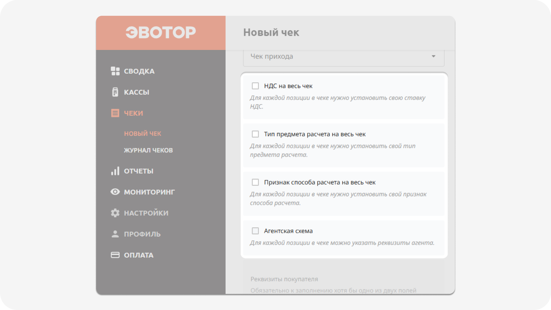 Чеки → Новый чек → Обычный чек